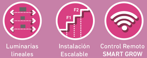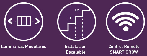 Permite controlar cada proceso del cultivo con equipos de espectro variable o fijo, adaptando la configuración base de las luminarias, en sistemas de 1 a N bloques independientes según necesidades.